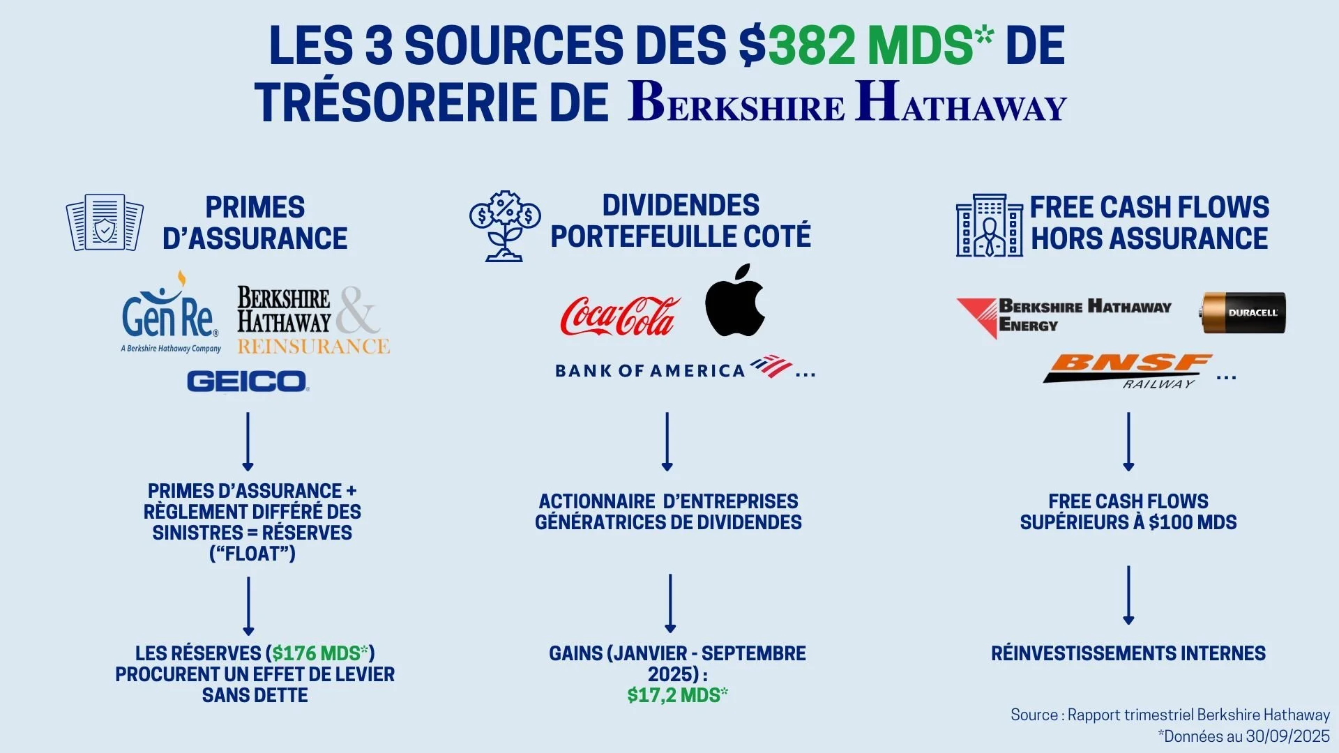 Cette mécanique produit un effet d’accumulation : Berkshire Hathaway détient aujourd’hui 382 Md$ de liquidités 💰 représentative d’une optionalité pure. Ainsi, ce n’est pas par manque de conviction que Warren Buffett n’a pas acheté d’actions en 2024, mais pour préserver sa capacité à agir le jour où une opportunité apparaîtra.